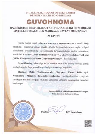 | 4997 | №005102 | Ilmiy ishlanma - «Ансвер пилларc» технологияси» | Raximov Zokir Toshtemirovich (34%), Choriyeva Zuhra Tolib qizi (33%), Keldiyorova Manzura G‘aybullayevna (33%) | Raximov Zokir Toshtemirovich, Choriyeva Zuhra Tolib qizi, Keldiyorova Manzura G‘aybullayevna | 10/04/2022 | ![]() |