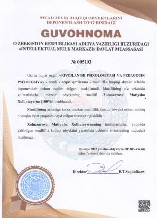| 4996 | №005103 | O‘quv qo‘llanma - "RIVOJLANISH PSIXOLOGIYASI VA PEDAGOGIK PSIXOLOGIYA" | Xolnazarova Matlyuba Xolbutayevna (100%) | Xolnazarova Matlyuba Xolbutayevna | 10/06/2022 | ![]() |