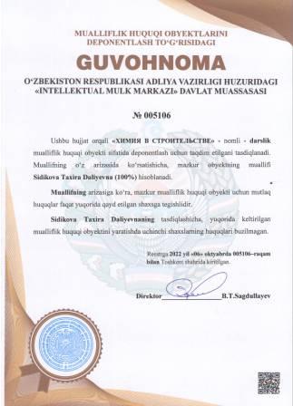 | 4993 | №005106 | Darslik - "ХИМИЯ В СТРОИТЕЛЬСТВЕ" | Sidikova Taxira Daliyevna (100%) | Sidikova Taxira Daliyevna | 10/06/2022 | ![]() |