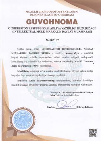 | 4992 | №005107 | Monografiya - "ИННОВАЦИОН ИҚТИСОДИЁТДА АЁЛЛАР МЕҲНАТИНИ ТАШКИЛ ЭТИШ" | Irmatova Aziza Baxramovna (100%) | Irmatova Aziza Baxramovna | 10/06/2022 | ![]() |
