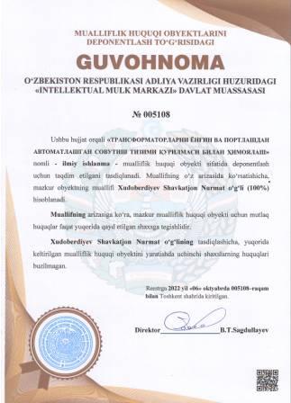 | 4991 | №005108 | Ilmiy ishlanma - "ТРАНСФОРМАТОРЛАРНИ ЁНҒИН ВА ПОРТЛАШДАН АВТОМАТЛАШГАН СОВУТИШ ТИЗИМИ ҚУРИЛМАСИ БИЛАН ҲИМОЯЛАШ" | Xudoberdiyev Shavkatjon Nurmat o‘g‘li (100%) | Xudoberdiyev Shavkatjon Nurmat o‘g‘li | 10/06/2022 | ![]() |