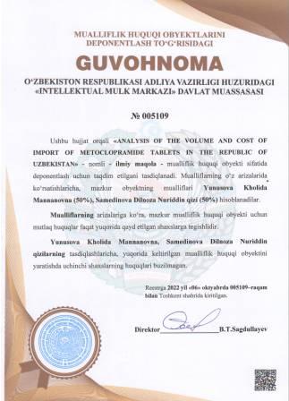 | 4990 | №005109 | Ilmiy maqola -"ANALYSIS OF THE VOLUME AND COST OF IMPORT OF METOCLOPRAMIDE TABLETS IN THE REPUBLIC OF UZBEKISTAN" | Yunusova Kholida Mannanovna (50%), Samedinova Dilnoza Nuriddin qizi (50%) | Yunusova Kholida Mannanovna, Samedinova Dilnoza Nuriddin qizi | 10/06/2022 | ![]() |