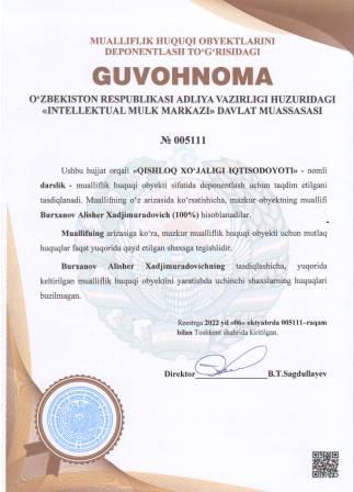 | 4988 | №005111 | Darslik - "QISHLOQ XO‘JALIGI IQTISODOYOTI" | Burxanov Alisher Xadjimuradovich (100%) | Burxanov Alisher Xadjimuradovich | 10/06/2022 | ![]() |