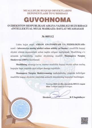 | 4987 | №005112 | laboratoriya mashg‘ulotlari uchun uslubiy qo‘llanma -"ODAM ANATOMIYASI VA FIZIOLOGIYASI" | Mannapova Nargiza Shakirovna (100%) | Mannapova Nargiza Shakirovna | 10/06/2022 | ![]() |