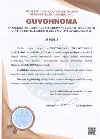 | 4986 | №005113 | O‘quv qo‘llanma - "UMURTQALILAR ZOOLOGIYASIDAN LABORATORIYA MASHG‘ULOTLARI" | Dadayev Saydulla (100%) | Dadayev Saydulla | 10/06/2022 | ![]() |