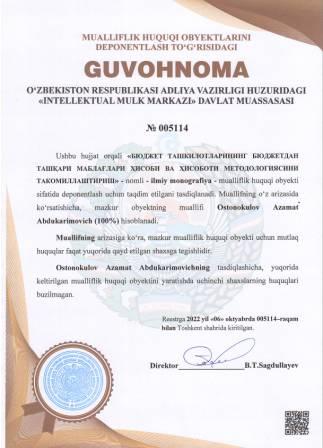 | 4985 | №005114 | Ilmiy imonografiya - "БЮДЖЕТ ТАШКИЛОТЛАРИНИНГ БЮДЖЕТДАН ТАШҚАРИ МАБЛАҒЛАРИ ҲИСОБИ ВА ҲИСОБОТИ МЕТОДОЛОГИЯСИНИ ТАКОМИЛЛАШТИРИШ" | Ostonokulov Azamat Abdukarimovich (100%) | Ostonokulov Azamat Abdukarimovich | 10/06/2022 | ![]() |