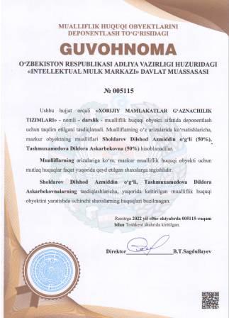 | 4984 | №005115 | Darslik - "XORIJIY MAMLAKATLAR G‘AZNACHILIK TIZIMLARI" | Sholdarov Dilshod Azmiddin o‘g‘li (50%), Tashmuxamedova Dildora Askarbekovna (50%) | Sholdarov Dilshod Azmiddin o‘g‘li, Tashmuxamedova Dildora Askarbekovna | 10/06/2022 | ![]() |