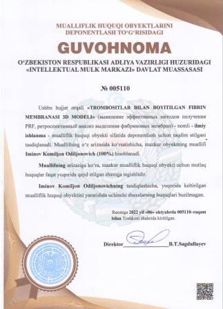 | 4989 | №005110 | Ilmiy ishlanma - "TROMBOSITLAR BILAN BOYITILGAN FIBRIN MEMBRANASI 3D MODELI" (выявление эффективных методов получения PRF, ретроспективный анализ выделения фибриновых мембран) | Iminov Komiljon Odiljonovich (100%) | Iminov Komiljon Odiljonovich | 10/06/2022 | ![]() |