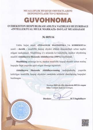 | 4983 | №005116 | Darslik - "PEDAGOGIK DIAGNOSTIKA VA KORREKSIYA" | Abdullayeva Shaxzoda Abdullayevna (100%) | Abdullayeva Shaxzoda Abdullayevna | 10/10/2022 | ![]() |