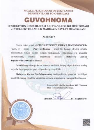 | 4982 | №005117 | O‘quv qo‘llanma - "ИСТОРИЯ РУССКОГО ЯЗЫКА И ДИАЛЕКТОЛОГИЯ" (часть 1) | Babayeva Zarina Sayfullaevna (100%) | Babayeva Zarina Sayfullaevna | 10/10/2022 | ![]() |