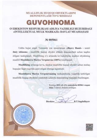 | 5038 | №005061 | Ilmiy ishlanma - Тренажёр для предплечья: "Heavy Hand" | Muxitdinova Mariya Yevgenevna (100%) | Muxitdinova Mariya Yevgenevna | 09/13/2022 | ![]() |