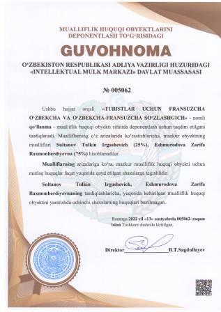 | 5037 | №005062 | Qo‘llanma -"TURISTLAR UCHUN FRANSUZCHA O‘ZBEKCHA VA O‘ZBEKCHA-FRANSUZCHA SO‘ZLASHGICH" | Sultanov Tulkin Irgashevich (25%), Eshmurodova Zarifa Raxmonberdiyevna (75%) | Sultanov Tulkin Irgashevich, Eshmurodova Zarifa Raxmonberdiyevna | 09/13/2022 | ![]() |
