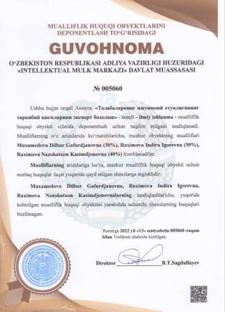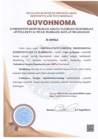| 5035 | №005064 | O‘quv qo‘llanma -"TRENER-O‘QITUVCHINING PROFESSIONAL KOMPETENTLIGI VA MAHORATI" | Yuldasheva Nargiza Egamberdiyevna (100%) | Yuldasheva Nargiza Egamberdiyevna | 09/13/2022 | ![]() |