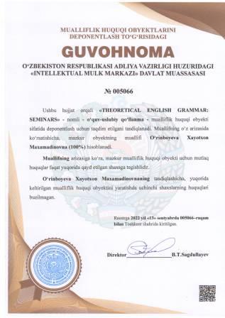 | 5033 | №005066 | O‘quv - uslubiy qo‘llanma -"THEORETICAL ENGLISH GRAMMAR: SEMINARS" | O‘rinboyeva Xayotxon Maxamadinovna (100%) | O‘rinboyeva Xayotxon Maxamadinovna | 09/13/2022 | ![]() |