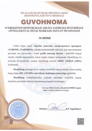| 5031 | №005068 | Grafik asarning dizayni - «Дизайн упаковки лекарственного препарата «TABONIL (ТАБОНИЛ)» (лиофилизированный порошок для приготовления раствора для инъекций) | ZHOU ANJIAN (100%) | «MU LIN SEN» mas’uliyati cheklangan jamiyati | 09/16/2022 | ![]() |