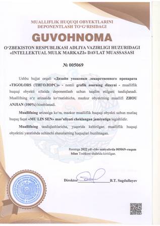 | 5030 | №005069 | Grafik asarning dizayni - «Дизайн упаковки лекарственного препарата «TIGOLORS (ТИГОЛОРС)» | ZHOU ANJIAN (100%) | «MU LIN SEN» mas’uliyati cheklangan jamiyati | 09/16/2022 | ![]() |