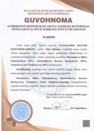 | 5040 | №005059 | Ilmiy ishlanma - Тренинг дастури: "ТАЛАБАНИНГ ШАХСИЙ ИДЕНТИФИКАЦИЯСИ" | Muxamedova Dilbar Gafurdjanovna (30%), Qudratullayeva Ruxsora Baxtiyarovna (30%), Turgunova Gulru Todjiboyevna (40%) | Muxamedova Dilbar Gafurdjanovna, Qudratullayeva Ruxsora Baxtiyarovna, Turgunova Gulru Todjiboyevna | 09/13/2022 | ![]() |