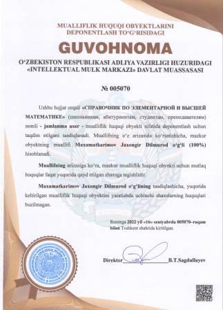 | 5029 | №005070 | Jamlanma asar - "СПРАВОЧНИК ПО ЭЛЕМЕНТАРНОЙ И ВЫСШЕЙ МАТЕМАТИКЕ" (школьникам, абитуриентам, студентам, преподавателям) | Maxamatkarimov Jaxongir Dilmurod o‘g‘li (100%) | Maxamatkarimov Jaxongir Dilmurod o‘g‘li | 09/16/2022 | ![]() |