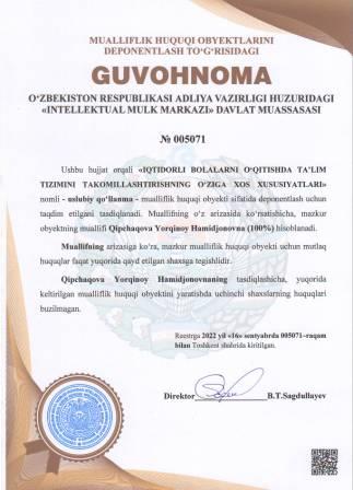 | 5028 | №005071 | Uslubiy qo‘llanma - "IQTIDORLI BOLALARNI O‘QITISHDA TA’LIM TIZIMINI TAKOMILLASHTIRISHNING O‘ZIGA XOS XUSUSIYATLARI" | Qipchaqova Yorqinoy Hamidjonovna (100%) | Qipchaqova Yorqinoy Hamidjonovna | 09/16/2022 | ![]() |