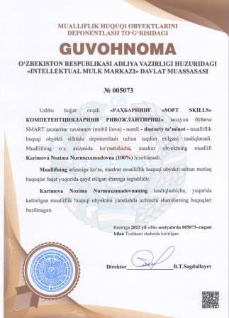 | 5026 | №005073 | Dasturiy ta’minot-"РАҲБAРНИНГ "SOFT SKILLS" КОМПЕТЕНТЦИЯЛАРИНИ РИВОЖЛАНТИРИШ" модули бўйича SMART дидактик таъминот (mobil ilova) | Karimova Nozima Nurmuxamadovna (100%) | Karimova Nozima Nurmuxamadovna | 09/16/2022 | ![]() |