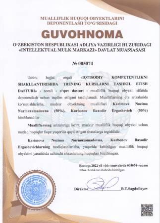 | 5025 | №005074 | O‘quv dasturi -"IQTISODIY KOMPETENTLIKNI SHAKLLANTIRISHDA TRENING KURSLARNI TASHKIL ETISH DASTURI" | Karimova Nozima Nurmuxamadovna (50%), Kurbonov Baxodir Ergashevich (50%) | Karimova Nozima Nurmuxamadovna, Kurbonov Baxodir Ergashevich | 09/16/2022 | ![]() |