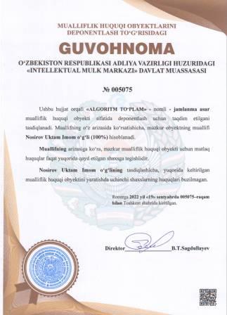 | 5024 | №005075 | Jamlanma asar - "ALGORITM TO‘PLAM" | Nosirov Uktam Imom o‘g‘li (100%) | Nosirov Uktam Imom o‘g‘li | 09/19/2022 | ![]() |