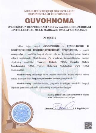 | 5023 | №005076 | Monografiya - "ВОЛОЧЕНИЯ - ТЕХНОЛОГИЯ И ОБОРУДОВАНИЯ ПРОИЗВОДСТВЕННЫХ ПРОДУКЦИЙ" | Turayev Tirkash (70%), Otaqulov Oybek Xamdamovich (15%), Tojiyev Boburbek Abdulxakim o‘g‘li (15%) | Farg‘ona politexnika instituti | 09/20/2022 | ![]() |