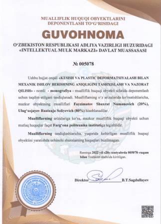 | 5021 | №005078 | Monografiya - "KESISH VA PLASTIC DEFORMATSIYALASH BILAN MEXANIK ISHLOV BERISHNING ANIQLIGINI TASHXISLASH VA NAZORAT QILISH" | Fayzimatov Shuxrat Numanovich (20%), Ulug‘xojayev Ruzixuja Soliyevich (80%) | Farg‘ona politexnika instituti | 09/20/2022 | ![]() |