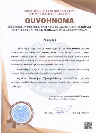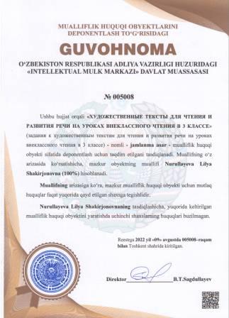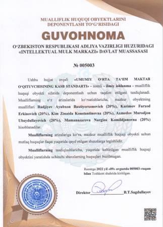 | 5096 | №005003 | Ilmiy ishlanma - "UMUMIY O‘RTA TA‘lIM MAKTAB O‘QITUVCHISINING KASB STANDARTI" | Radjiyev Ayubxon Baxtiyorxonovich (20%), Karimov Farxod Erkinovich (20%), Kim Zinaida Konstantinovna (20%), Axmedov Murodjon Ubaydullayevich (20%), Mamanazarova Nargiza Komildjanovna (20%) | Radjiyev Ayubxon Baxtiyorxonovich, Karimov Farxod Erkinovich, Kim Zinaida Konstantinovna, Axmedov Murodjon Ubaydullayevich, Mamanazarova Nargiza Komildjanovna | 08/09/2022 | ![]() |