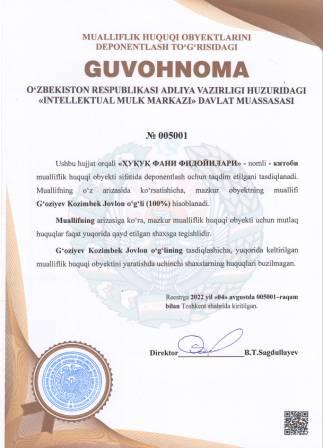| 5098 | №005001 | Kitob - "ҲУҚУҚ ФАНИ ФИДОЙИЛАРИ" | G‘oziyev Kozimbek Jovlon o‘g‘li (100%) | G‘oziyev Kozimbek Jovlon o‘g‘li | 08/04/2022 | ![]() |