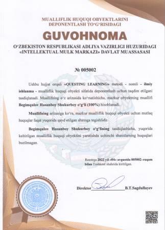 | 5097 | №005002 | Ilmiy ishlanma - "QUESTING LEARNING" metodi | Begimqulov Hasanboy Shukurboy o‘g‘li (100%) | Begimqulov Hasanboy Shukurboy o‘g‘li | 08/04/2022 | ![]() |
