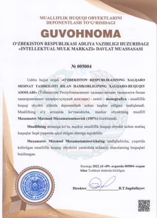 | 5095 | №005004 | Monografiya - "O'ZBEKISTON RESPUBLIKASINING XALQARO MEHNAT TASHKILOTI BILAN HAMKORLIGINING XALQARO-HUQUQIY ASOSLARI" (Ўзбекистон Республикасининг халқаро меҳнат ташкилоти билан ҳамкорлигининг халқаро-ҳуқуқий асослари) | Maxamatov Maxmud Maxamataminovich (100%) | Maxamatov Maxmud Maxamataminovich | 08/09/2022 | ![]() |