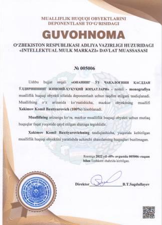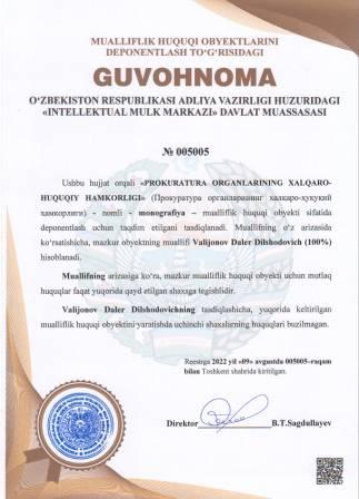 | 5094 | №005005 | Monografiya - "PROKURATURA ORGANLARINING XALQARO-HUQUQIY HAMKORLIGI" (Прокуратура органларининг халқаро-ҳуқуқий ҳамкорлиги) | Valijonov Daler Dilshodovich (100%) | Valijonov Daler Dilshodovich | 08/09/2022 | ![]() |
