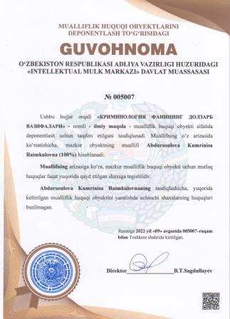 | 5092 | №005007 | Ilmiy maqola -"КРИМИНОЛОГИЯ ФАНИНИНГ ДОЛЗАРБ ВАЗИФАЛАРИ" | Abdurasulova Kumrinisa Raimkulovna (100%) | Abdurasulova Kumrinisa Raimkulovna | 08/09/2022 | ![]() |