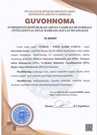 | 5090 | №005009 | Innovatsion loyiha -"TURIZM – INSON QADRI UCHUN" | Fazilova Charosxon Mansurbek qizi (25%), Yusupova Indira Rustamovna (25%), Yo‘ldoshov Hakimboy Yarashbayevich (25%), Hajiyev Izzat Shuhratovich (25%) | Fazilova Charosxon Mansurbek qizi, Yusupova Indira Rustamovna, Yo‘ldoshov Hakimboy Yarashbayevich, Hajiyev Izzat Shuhratovich | 08/09/2022 | ![]() |