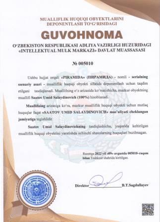 | 5089 | №005010 | Serialning ssenariy asari - "PIRAMIDA" (ПИРАМИДА) | Saatov Umid Salaydinovich (100%) | "SAATOV UMID SALAYDINOVICH" mas’uliyati cheklangan jamiyati | 08/09/2022 | ![]() |