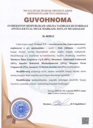 | 5087 | №005012 | Ilmiy ishlanma - "Синтез N,N’ – гексаметилен бис [(орто-крезолило)-карбамата] и его применение" | Mashayev Eldor Ergashvoy o‘g‘li (50%), Maxsumov Abduxamid Gofurovich (30%), Ismailov Boburbek Maxmudjanovich (10%), Shapatov Feruz Utaganovich (5%), Azamatov O‘tkirbek Rashidovich (5%) | Mashayev Eldor Ergashvoy o‘g‘li, Maxsumov Abduxamid Gofurovich, Ismailov Boburbek Maxmudjanovich, Shapatov Feruz Utaganovich, Azamatov O‘tkirbek Rashidovich | 08/10/2022 | ![]() |
