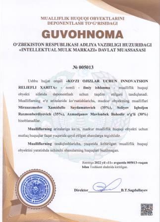 | 5086 | №005013 | Ilmiy ishlanma - "KO‘ZI OJIZLAR UCHUN INNOVATSION RELIEFLI XARITA" | Mirzaaxmedov Xamidullo Saydamatovich (35%), Soliyev Iqboljon Raxmonberdiyevich (35%), Axmadjanov Mavlonbek Bahodir o‘g‘li (30%) | Mirzaaxmedov Xamidullo Saydamatovich, Soliyev Iqboljon Raxmonberdiyevich, Axmadjanov Mavlonbek Bahodir o‘g‘li | 08/11/2022 | ![]() |