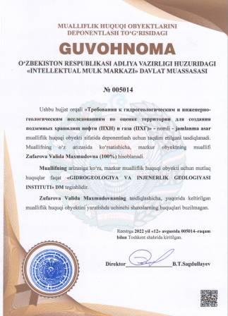 | 5085 | №005014 | Jamlanma asar - Требования к гидрогеологическим и инженерно-геологическим исследованиям по оценке территории для создания подземных хранилищ нефти (ПХН) и газа (ПХГ)" | Zufarova Valida Maxmudovna (100%) | "GIDROGEOLOGIYA VA INJENERLIK GEOLOGIYASI INSTITUTI" DM | 08/12/2022 | ![]() |
