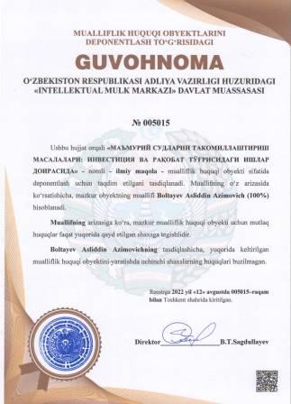 | 5084 | №005015 | Ilmiy maqola -"МАЪМУРИЙ СУДЛАРНИ ТАКОМИЛЛАШТИРИШ МАСАЛАЛАРИ: ИНВЕСТИЦИЯ ВА РАҚОБАТ ТЎҒРИСИДАГИ ИШЛАР ДОИРАСИДА" | Boltayev Asliddin Azimovich (100%) | Boltayev Asliddin Azimovich | 08/12/2022 | ![]() |