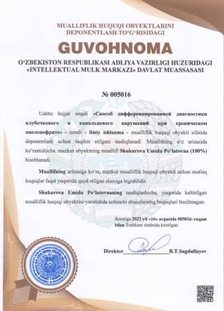 | 5083 | №005016 | Ilmiy ishlanma - "Способ дифференцированной диагностики клубочкового и канальцевого нарушений при хроническом пиелонефрите" | Shukurova Umida Po‘latovna (100%) | Shukurova Umida Po‘latovna | 08/16/2022 | ![]() |