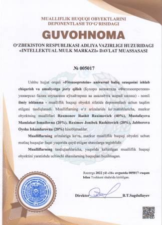| 5082 | №005017 | Ilmiy ishlanma - "Fitozooprotein" universal baliq ozuqasini ishlab chiqarish va amaliyotga joriy qilish (Бухоро вилоятида "Фитозоопротеин" универсал балиқ озуқасини кўпайтириш ва амалиётга жорий қилиш) | Raxmonov Rashit Raximovich (40%), Mustafayeva Mamlakat Ismailovna (20%), Raximov Jonibek Rashitovich (20%), Jabborova Oysha Iskandarovna (20%) | Raxmonov Rashit Raximovich, Mustafayeva Mamlakat Ismailovna, Raximov Jonibek Rashitovich, Jabborova Oysha Iskandarovna | 08/16/2022 | ![]() |