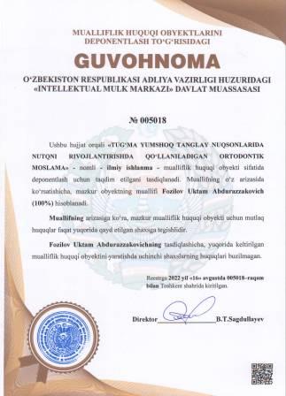 | 5081 | №005018 | Ilmiy ishlanma - "TUG‘MA YUMSHOQ TANGLAY NUQSONLARIDA NUTQNI RIVOJLANTIRISHDA QO‘LLANILADIGAN ORTODONTIK MOSLAMA" | Fozilov Uktam Abdurazzakovich (100%) | Fozilov Uktam Abdurazzakovich | 08/16/2022 | ![]() |