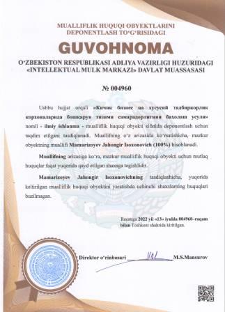 | 5139 | №004960 | Ilmiy ishlanma - "Кичик бизнес ва хусусий тадбиркорлик корхоналарида бошқарув тизими самарадорлигини баҳолаш усули" | Mamarizoyev Jahongir Isoxonovich (100%) | Mamarizoyev Jahongir Isoxonovich | 07/13/2022 | ![]() |