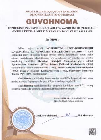 | 5138 | №004961 | Jamlanma asar - "ЎЗБЕКИСТОН РЕСПУБЛИКАСИНИНГ БОҒДОРЧИЛИК ВА УЗУМЧИЛИК ВЕБ-АТЛАСИНИ ЯРАТИШ" | Mo‘minov Abdujalil Abdusalom o‘g‘li (40%), Egamberdiyev Asamberdi (10%), Safarov Eshkabul Yuldashovich (10%), Salaxitdinova Sevar Saidaminovna (10%), Prenov Shavkat Mametsaliyevich (10%), Bekanov Kuatbay Koshkarbayevich (10%), Uyrayimov Sunnatulla Tilaboy o‘g‘li (10%) | Mo‘minov Abdujalil Abdusalom o‘g‘li, Egamberdiyev Asamberdi, Safarov Eshkabul Yuldashovich, Salaxitdinova Sevar Saidaminovna, Prenov Shavkat Mametsaliyevich, Bekanov Kuatbay Koshkarbayevich, Uyrayimov Sunnatulla Tilaboy o‘g‘li | 07/13/2022 | ![]() |