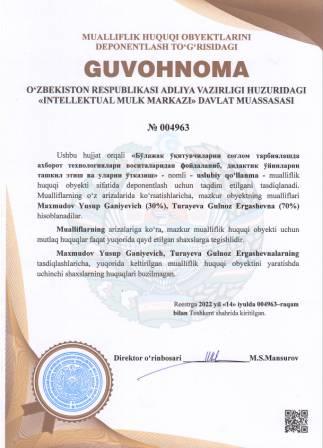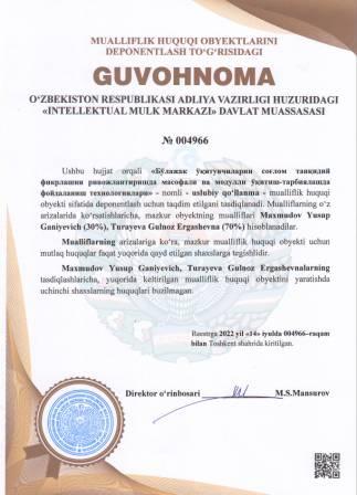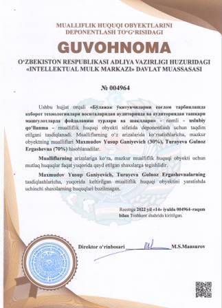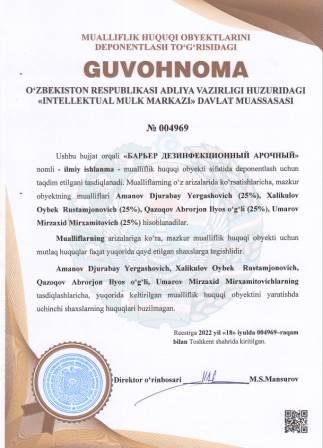 | 5130 | №004969 | Ilmiy ishlanma - "БАРЬЕР ДЕЗИНФЕКЦИОННЫЙ АРОЧНЫЙ" | Amanov Djurabay Yergashovich (25%), Xalikulov Oybek Rustamjonovich (25%), Qazoqov Abrorjon Ilyos o‘g‘li (25%), Umarov Mirzaxid Mirxamitovich (25%) | Amanov Djurabay Yergashovich, Xalikulov Oybek Rustamjonovich, Qazoqov Abrorjon Ilyos o‘g‘li, Umarov Mirzaxid Mirxamitovich | 07/18/2022 | ![]() |