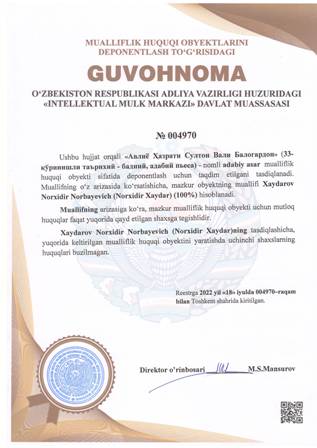 | 5129 | №004970 | Adabiy asar - «Авлиё Ҳазрати Султон Вали Балогардон» (33- кўринишли таърихий - бадиий, адабий пьеса) | Xaydarov Norxidir Norbayevich (Norxidir Xaydar) (100%) | Xaydarov Norxidir Norbayevich (Norxidir Xaydar) | 07/18/2022 | ![]() |