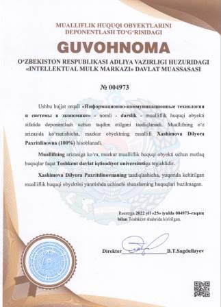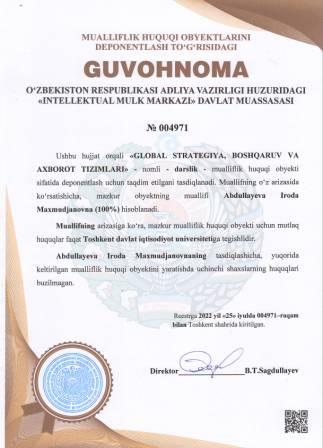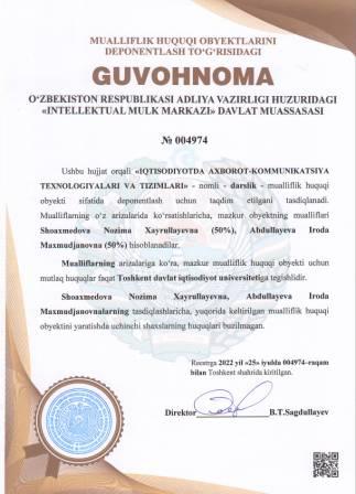 | 5125 | №004974 | Darslik - "IQTISODIYOTDA AXBOROT-KOMMUNIKATSIYA TEXNOLOGIYALARI VA TIZIMLARI" | Shoaxmedova Nozima Xayrullayevna (50%), Abdullayeva Iroda Maxmudjanovna (50%) | Toshkent davlat iqtisodiyot universiteti | 07/25/2022 | ![]() |