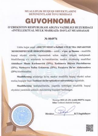 | 5123 | №004976 | O‘quv qo‘llanma -"ИНСТРУМЕНТАЛЬНЫЕ СРЕДСТВА ОБРАБОТКИ ЭКОНОМИЧЕСКОЙ ИНФОРМАЦИИ" | Abdullayev Munis Kurbonovich (25%), Xashimova Dilyora Paxritdinovna (25%), Norboyeva Nafisa Erkinovna (25%), Parpiyeva Ra’no Abdurasulova (25%) | Toshkent davlat iqtisodiyot universiteti | 07/25/2022 | ![]() |