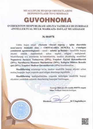 | 5121 | №004978 | Uslubiy qo‘llanma - "Xorazm viloyati tuproq - iqlim sharoitida noan'anaviy dukkakli ekin – CROTALARIA JUNCEA L. o‘simligini yetishtirish agrotexnologiyasi" | Negmatova Surayyo Teshayevna (25%), Yoqubov Gayrat Kuvandikovich (20%), Nurullayeva Manzura Shavkatovna (20%), Xoliqova Dildora Boxodir qizi (20%), Yoqubov Shuhrat Quvandikovich (15%) | Negmatova Surayyo Teshayevna, Yoqubov Gayrat Kuvandikovich, Nurullayeva Manzura Shavkatovna, Xoliqova Dildora Boxodir qizi, Yoqubov Shuhrat Quvandikovich | 07/25/2022 | ![]() |